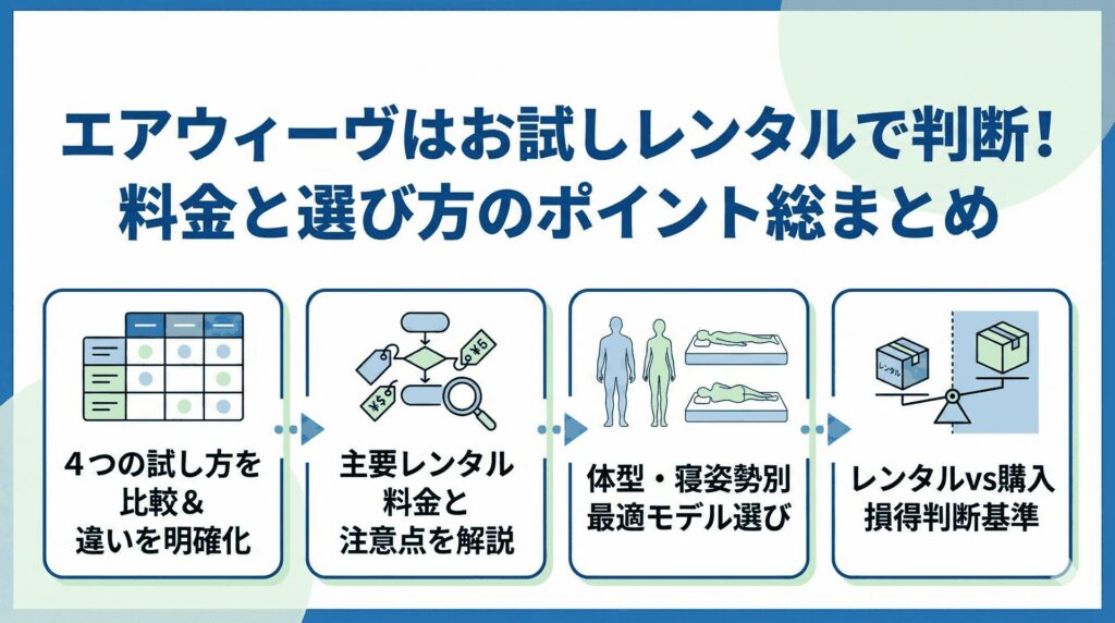 エアウィーヴを試す方法は、大きく分けて4つあります。それぞれの特徴を理解して、自分に合った方法を選びましょう。