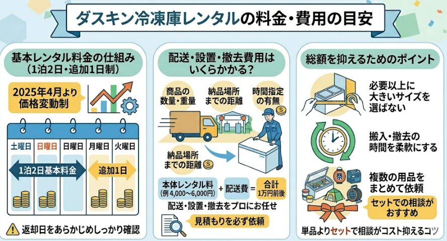 中でも全国に100以上の店舗を持つダスキンレントオールは、イベント向け冷凍庫レンタルの定番として知られています。しかし「料金の総額がよくわからない」「どの機種を選べばいいかわからない」「申し込みは何日前までにすればいい?」といった疑問を持つ方も多いのが現実です。