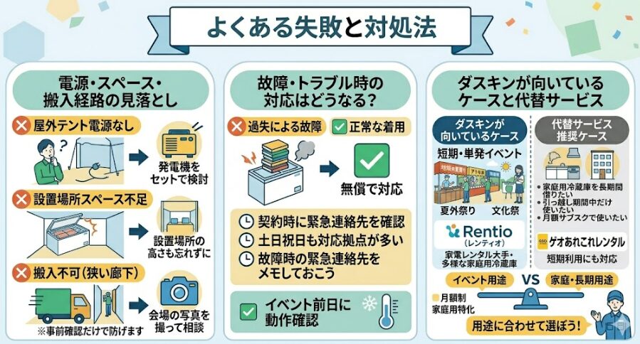 ダスキンは土日祝日でも対応できる拠点が多く、万が一のトラブルにも比較的迅速に対応してもらえるとされています。万全を期すなら、大規模イベントの場合は予備として同型の機器を追加でレンタルしておくことも選択肢のひとつです。また、イベント前日に必ず動作確認を行い、冷却が正常に始まっているかをチェックしてから食材を入れるようにしましょう。