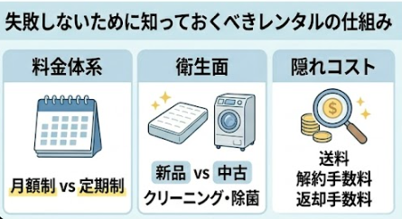 マットレスのレンタルを検討するとき、月額料金だけを見て判断するのは危険です。申込時には見えにくい「隠れコスト」が、トータルの費用を大きく左右することがあります。