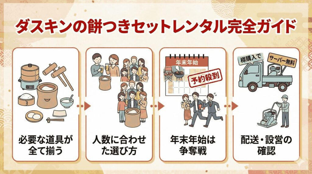 - 必要な道具が全て揃う:石臼・杵・セイロ・かまどなど、本格的な餅つきセット一式をダスキンで手配可能。