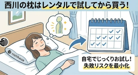 そこで注目したいのが、西川の枕をレンタルで自宅試しできるサービスです。数千円〜数百円の費用で実際に自宅の布団で眠ってみて、納得してから購入を決める。この方法なら、高いお金を払って失敗するリスクをぐっと減らせます。