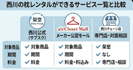 - ✅ 西川の枕レンタルサービスの種類と違いが一目でわかる