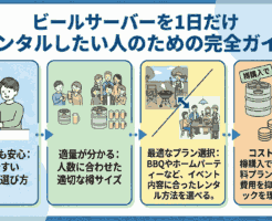 イベントを盛り上げるために、「生ビールサーバーを1日だけレンタルしたい」と思っても、どの業者を選べば良いのか、どれくらいの量を準備すべきか、初心者には判断が難しく感じられます。 準備に失敗すると、ビールが足りなかったり、 […]