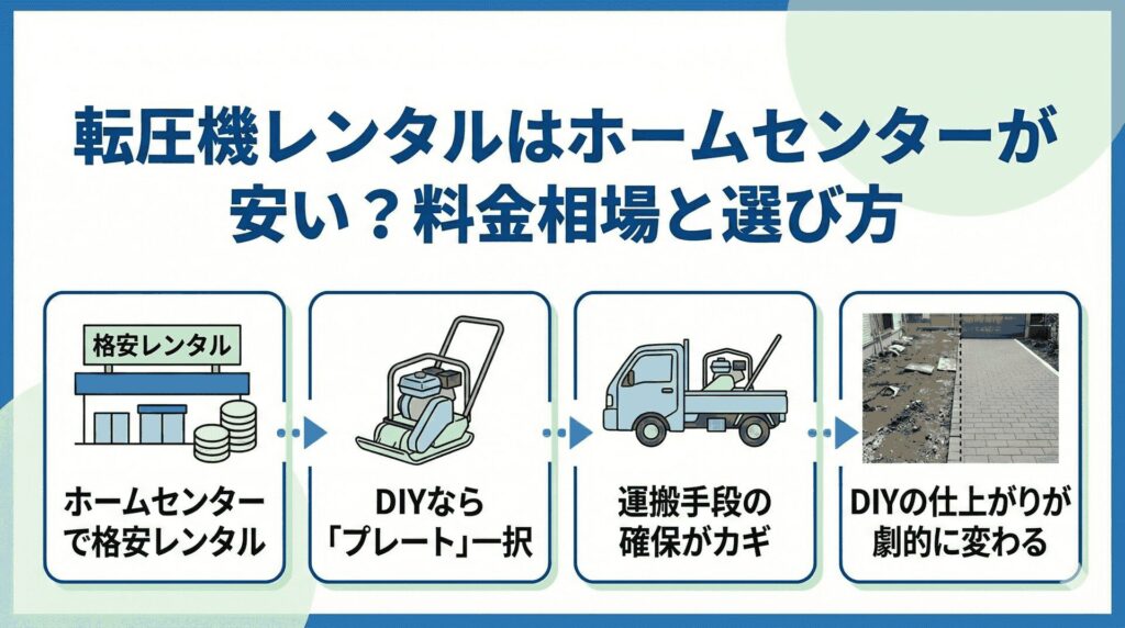 - コーナンPRO: 店舗によっては工具レンタルを行っていますが、電動工具が中心でエンジン工具(転圧機)は扱いがない場合も多いので要確認。