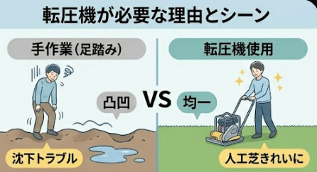 地面を足で踏み固める方法では、どうしても力にムラが出やすく、均一に締め固めることが難しくなります。特に人工芝や砂利敷きでは、下地が不均一だと仕上がりが波打ったり、一部だけ沈み込んだりする原因になります。